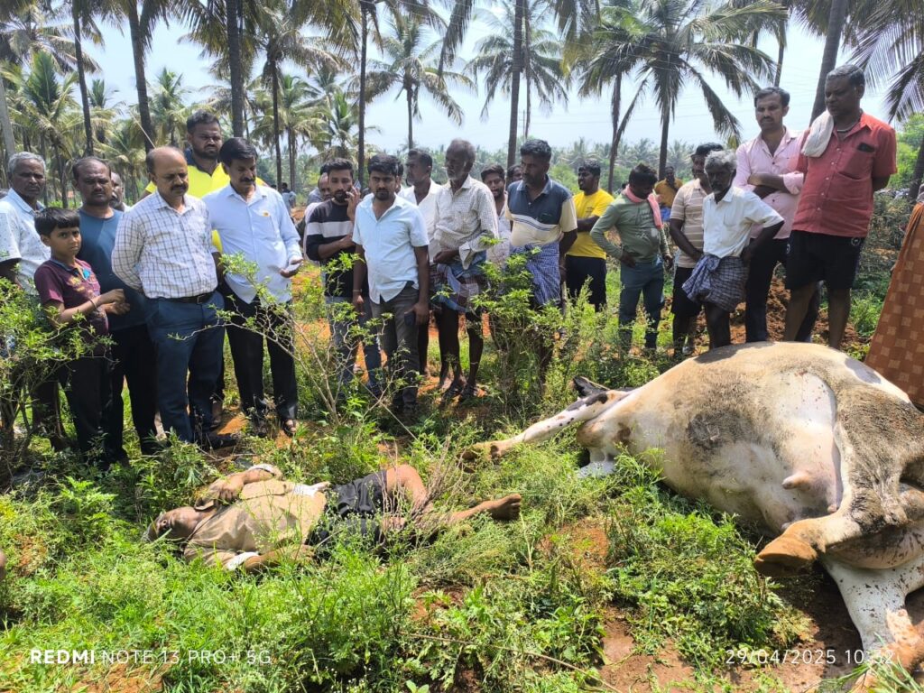 ನಿತ್ಯಕೆಲಸದಂತೆ ತಮ್ಮ ಎರಡು ಸೀಮೆ ಹಸುಗಳಿಂದ ಹಾಲು ಕರೆದು.ಮೇಯಿಸಲು ತಮ್ಮ ಚಿಕ್ಕಕೊಟ್ಟಿಗೆಹಳ್ಳಿ ಸರ್ವೇಬರ್ ನ ತೋಟಕ್ಕೆ ಹೋಗಿದ್ದಾರೆ,ಆದರೆ, ರಾತ್ರಿ ಮಳೆಗಾಳಿಯಿಂದ ವಿದ್ಯುತ್ ತಂತಿ ತುಂಡಾಗಿ ಬಿದ್ದಿರುವುದನ್ನ ಗಮನಿಸದೆ ಆಕಸ್ಮಿಕವಾಗಿ ತಮ್ಮ ಹಸುಗಳು ಹಾಗೂ ಯೋಗೇಶ್ ವಿದ್ಯುತ್ ತಂತಿ ಸ್ಪರ್ಶಿಸಿ ಸ್ಥಳದಲ್ಲೇ ಸಾವನ್ನಪ್ಪಿದ್ದಾರೆ.ಸ್ಥಳಕ್ಕೆ ತಿಪಟೂರು ಗ್ರಾಮಾಂತರ ಠಾಣೆ ಸಬ್ ಇನ್ಪೆಕ್ಟರ್ ನಾಗರಾಜು.ಬೆಸ್ಕಾಂ ಇಲಾಖೆ ಎಇಇ ಮನೋಹರ್.ಸೇರಿದಂತೆ ಕಂದಾಯ ಇಲಾಖೆ ,ಪಶುಸಂಗೋಪನೆ ಇಲಾಖೆ ಅಧಿಕಾರಿಗಳು ಪರಿಶೀಲನೆ ನಡೆಸಿದ್ದು, ತಿಪಟೂರು ಗ್ರಾಮಾಂತರ ಪೊಲೀಸ್ ಠಾಣೆಯಲ್ಲಿ ಪ್ರಕರಣ ದಾಖಲಿಸಿ ತನಿಖೆ ಕೈಗೊಳ್ಳಲಾಗಿದೆ
