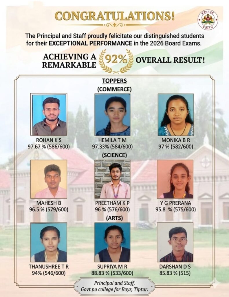 : ಈ ಬಾರಿಯ ದ್ವಿತೀಯ ಪಿಯುಸಿ ಪರೀಕ್ಷೆ-01ರಲ್ಲಿ ತಿಪಟೂರು ಬಾಲಕರ ಸರ್ಕಾರಿ ಪದವಿ ಪೂರ್ವ ಕಾಲೇಜು ತನ್ನ ಇತಿಹಾಸದಲ್ಲೇ ಅತ್ಯಧಿಕವಾದ ಶೇಕಡ 92ರ ಫಲಿತಾಂಶ ದಾಖಲಿಸಿದ್ದು ಹರ್ಷ ತಂದಿದೆ ಎಂದು ಪ್ರಾಂಶುಪಾಲ ಎಂ.ಡಿ. ಶಿವಕುಮಾರ್ ತಿಳಿಸಿದ್ದಾರೆ.