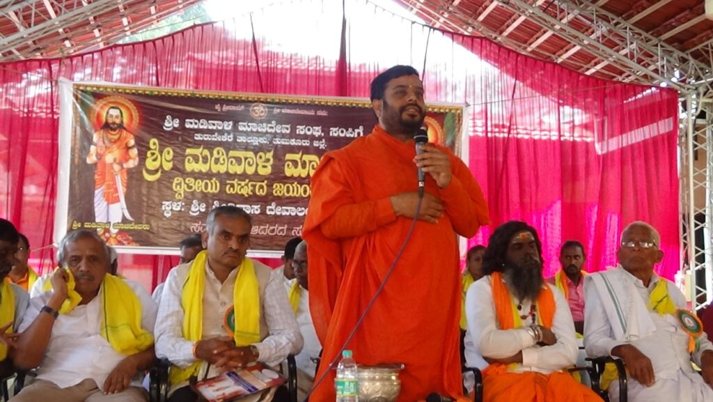 ಸದರಿ ಕಾರ್ಯಕ್ರಮದ ದಿವ್ಯ ಸಾನಿಧ್ಯ ವಹಿಸಿ ಚಿತ್ರದುರ್ಗ ಶ್ರೀ ಮಾಚಿದೇವ ಮಹಾ ಸಂಸ್ಥಾನ ಮಠದ ಜಗದ್ಗುರು ಡಾ. ಶ್ರೀ ಶ್ರೀ ಬಸವ ಮಾಚಿದೇವ ಮಹಾಸ್ವಾಮಿಗಳು ಮಾತನಾಡಿ ಮಡಿವಾಳ ಸಮುದಾಯಕ್ಕೆ ಸಾವಿರಾರು ವರ್ಷಗಳ ಇತಿಹಾಸವಿದೆ ನಮ್ಮ ಸಮುದಾಯದ ಪದ್ಧತಿಗಳಾದ ಮಡಿ ಹಾಕುವುದು, ಅಂಗಾರಾ ಹಾಕುವುದು ಸಂಸ್ಕೃತಿಯ ಪ್ರತೀಕವಾಗಿದೆ ಅಲ್ಲದೆ ಮಡಿವಾಳ ಶ್ರೀ ಮಾಚಿದೇವರು ಶರಣರ ಬಟ್ಟೆ ತೊಳೆಯುವ ಕಾರ್ಯದಿಂದ ಅಂದು ತೊಡಗಿಸಿಕೊಂಡ ಪರಿಣಾಮವಾಗಿ ಇಂದು ನಾವು ನಾವು ತಲೆಯೆತ್ತಿ ಸಮಾಜದಲ್ಲಿ ನಿಲ್ಲುವ ಶಕ್ತಿ ತುಂಬಿದ್ದಾರೆ. ದೀಪವು ತನ್ನನ್ನು ತಾನು ಸುಟ್ಟುಕೊಂಡು ಬೆಳಕು ನೀಡುವ ಹಾಗೆ ಶ್ರೀ ಮಡಿವಾಳ ಮಾಚಿದೇವ ಅಂದಿನ ಸಮಾಜದ ಶೋಷಣೆ ಗಳಿಂದ ಸುಟ್ಟುಕೊಂಡು ವಚನಗಳ ಸಂರಕ್ಷಿಸಿ ತಾನು ವಚನಗಳನ್ನು ರಚಿಸಿದ ಮಹಾನ್ ವ್ಯಕ್ತಿಯಾಗಿ ಹೊರಹೊಮ್ಮಿದ್ದಾರೆ ಅಂದು ಶ್ರೀ ಮಾಚಿದೇವ ಬಟ್ಟೆ ತೊಳೆಯುವ ಕಾಯಕದಿಂದ ಕ್ರಾಂತಿ ಮಾಡಿದ್ದರು ಇಂದು ನಿಮ್ಮ ಮಕ್ಕಳಿಗೆ ಉನ್ನತ ಶಿಕ್ಷಣ ನೀಡುವ ಮೂಲಕ ಸಮಾಜ ಮತ್ತು ಸಮುದಾಯಕ್ಕೂ ಕ್ರಾಂತಿ ಮಾಡಬೇಕಾದ ಜವಾಬ್ದಾರಿ ತಮ್ಮೆಲ್ಲರಿಗೂ ಇದೆ ಎಂದರು.