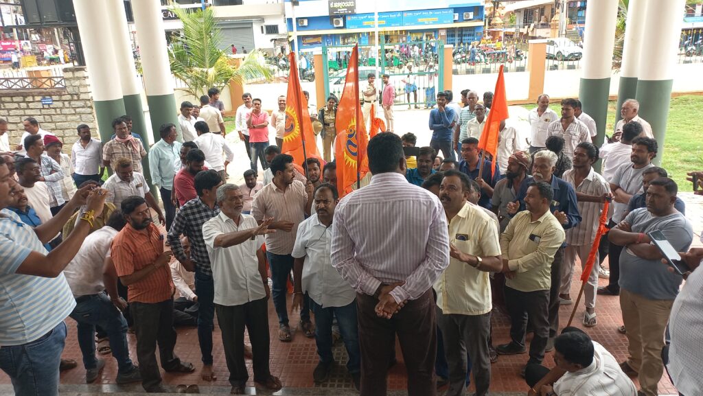 ನಗರಸಭೆ ಪೌರಾಯುಕ್ತರು ಹಾಗೂ ಪೋಲೀಸ್ ಇಲಾಖೆ ವಿರುದ್ದ ಘೋಷಣೆ ಕೂಗಿ ಆಕ್ರೋಶ ವ್ಯಕ್ತಪಡಿಸಿದ ಮುಖಂಡರು.ನಗರಸಭೆ ಪೌರಾಯುಕ್ತರು,ಕೂಡಲೇ ತಾವು ನೀಡಿರುವ ಪೊಲೀಸ್ ದೂರು ವಾಪಾಸ್ ಪಡೆಯಬೇಕು ನಗರಸಭೆ ಹಿಂದೂವಿರೋಧಿ ದೋರಣೆ ಮುಂದೂವರೆದಿದರೆ ಉಗ್ರಹೋರಾಟ ಮಾಡುವುದ್ದಾಗಿ ತಿಳಿಸಿದರು.