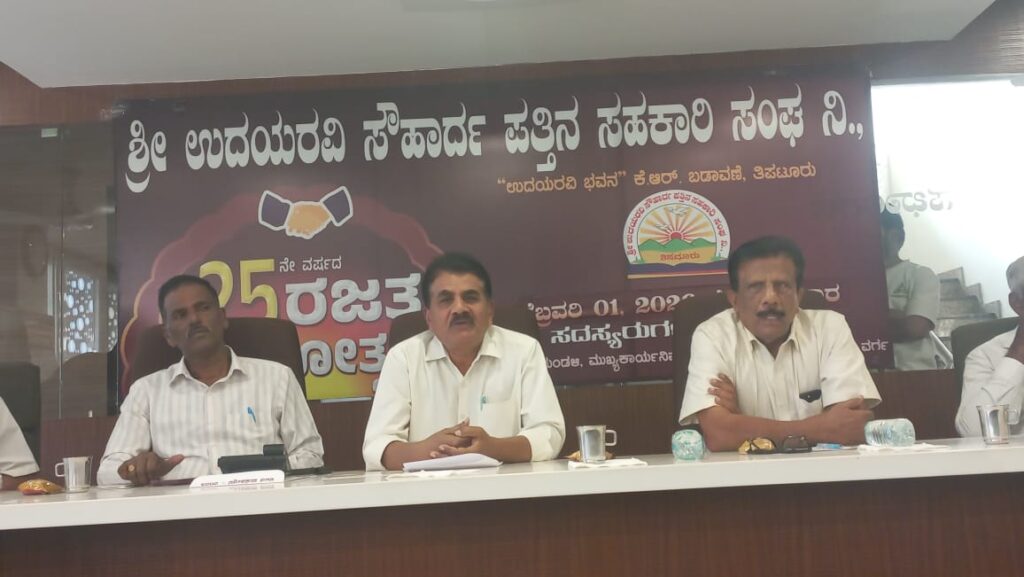 ನಗರದ ಕೆ.ಆರ್. ಬಡಾವಣೆಯಲ್ಲಿರುವ ಶ್ರೀ ಉದಯರವಿ ಭವನದ ಕಚೇರಿಯ ಸಭಾಂಗಣದಲ್ಲಿ ಹಮ್ಮಿಕೊಂಡಿದ್ದ ಶ್ರೀ ಉದಯರವಿ ಸೌಹಾರ್ದ ಪತ್ತಿನ ಸಹಕಾರಿ ಸಂಘ ನಿಯಮಿತದ 25ನೇ ವರ್ಷದ ರಜತ ಮಹೋತ್ಸವ-2025 ನಿಮಿತ್ತ ಆಯೋಜಿಸಿದ್ದ ಪತ್ರಿಕಾಗೋಷ್ಠಿಯಲ್ಲಿ ಮಾತನಾಡಿದ ಅವರು, ದಿನಾಂಕ:01/02/2026 ರ ಭಾನುವಾರ ಬೆಳಿಗ್ಗೆ 11 ಗಂಟೆಗೆ, ನಗರದ ಕಂಚಾಘಟ್ಟ ರಸ್ತೆಯಲ್ಲಿರುವ, ಪವರ್ ಸ್ಟೇಷನ್ ಹಿಂಭಾಗ, ಜಿ.ಕೆ.ಬಾಬು ಲೇಔಟ್ ನ ಆವರಣದ ಉದಯರವಿ ಮಂಟಪದಲ್ಲಿ ರಜತ ಮಹೋತ್ಸವ ಹಮ್ಮಿಕೊಂಡಿದ್ದು, 5/3/2000 ನೇ ವರ್ಷದಲ್ಲಿ, ರಾಜ್ಯ ಸಹಕಾರಿ ಕಾಯ್ದೆ 1959ರ ಅಡಿಯಲ್ಲಿ 156 ಸದಸ್ಯರು ಹಾಗೂ ಎರಡು ಲಕ್ಷ ಬಂಡವಾಳದೊಂದಿಗೆ, ಸಂಸ್ಥಾಪಕರಾದ ಎಂ.ಎಸ್. ಸೋಮಶೇಖರ್ ಸಂಘ ಸ್ಥಾಪಿಸಿ, 2004ರಲ್ಲಿ ಸೌಹಾರ್ದ ನಿಯಮಿತವಾಗಿ ಪ್ರತಿ ವರ್ಷ ಆರ್ಥಿಕ ಅಭಿವೃದ್ಧಿಯಲ್ಲಿ ಮುನ್ನಡೆ ಸಾಧಿಸಿಕೊಂಡು ಇಂದಿಗೂ ಬರುತ್ತಿದೆ. 2007ರಲ್ಲಿ ಕೆ.ಆರ್. ಬಡಾವಣೆಯಲ್ಲಿ ಸಹಕಾರಿಯ ಸ್ವಂತ ಕಟ್ಟಡವನ್ನು ಪಡೆದುಕೊಂಡು, 2013ರಲ್ಲಿ ಉತ್ತಮ ಸೌಹಾರ್ದ ಸಹಕಾರಿ ಸಂಸ್ಥೆ ಎಂದು ಪ್ರಶಸ್ತಿ ಪಡೆದು, 2014ರಲ್ಲಿ ಪಕ್ಕದ ತಾಲೂಕು ಅರಸೀಕೆರೆಯಲ್ಲಿ ಮೊದಲನೇ ಶಾಖೆ ಪ್ರಾರಂಭಿಸಿ, 2018-19ರ ಸಾಲಿನಲ್ಲಿ 3222 ಶೇರುದಾರರನ್ನು ಹೊಂದಿ, 145 ಕೋಟಿ ಬಂಡವಾಳ ಹೊಂದಿದ್ದು, ಶೇಕಡ 15 ಪರ್ಸೆಂಟ್ ಡಿವಿಡೆಂಟ್ ನೀಡಲಾಗಿರುತ್ತದೆ. ಎರಡನೇ ಶಾಖೆಯನ್ನು 2022ರಲ್ಲಿ ತುರುವೇಕೆರೆ ಪಟ್ಟಣದಲ್ಲಿ ಪ್ರಾರಂಭಿಸಿ, ಬೆಳ್ಳಿ ಹಬ್ಬದ ನೆನಪಿಗಾಗಿ ತಿಪಟೂರಿನಲ್ಲಿ ಸುಮಾರು 4 ಅಂತಸ್ತಿನ ಆಡಳಿತ ಕಟ್ಟಡ ನಿರ್ಮಾಣವು ಮುಕ್ತಾಯ ಹಂತದಲ್ಲಿ ಬಂದಿರುತ್ತದೆ. ನಿಯಮಿತದ ಶೇರುದಾರರು, ಸದಸ್ಯರು, ಪದಾಧಿಕಾರಿಗಳು ಹಾಗೂ ಸಿಬ್ಬಂದಿ ವರ್ಗ ರಜತ ಮಹೋತ್ಸವದ ಕಾರ್ಯಕ್ರಮಕ್ಕೆ ಪ್ರತಿಯೊಬ್ಬರು ಪಾಲ್ಗೊಂಡು, ಸುಗಮ ಸಂಗೀತ ಕಾರ್ಯಕ್ರಮ ಮತ್ತು ನಮ್ಮ ಆತಿಥ್ಯವನ್ನು ಸ್ವೀಕರಿಸಬೇಕೆಂದು ಹಾಗೂ ಶಾಸಕ ಕೆ.ಷಡಕ್ಷರಿ ಮತ್ತು ಮಾಜಿ ಸಚಿವ ನಾಗೇಶ್ ಸೇರಿದಂತೆ ಮುಖಂಡರುಗಳು, ವಿವಿಧ ಸಹಕಾರಿಯ ಮುಖಂಡರುಗಳು ಅಧ್ಯಕ್ಷರುಗಳು ಹಾಗೂ ಅಧಿಕಾರಿ ವರ್ಗ ಭಾಗವಹಿಸಲಿದ್ದಾರೆ ಎಂದು ತಿಳಿಸಿದರು.
