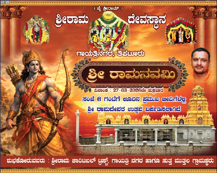 ತಿಪಟೂರು: ನಗರದ ಹಳೇಪಾಳ್ಯ ಪ್ರದೇಶದ ಗಾಯತ್ರಿನಗರದಲ್ಲಿರುವ ಶ್ರೀರಾಮ ಮಂದಿರದಲ್ಲಿ ಮಾರ್ಚ್ 27ರಂದು ರಾಮನವಮಿ ಹಬ್ಬವನ್ನು ಅದ್ದೂರಿಯಾಗಿ ಆಚರಿಸಲು ವಿವಿಧ ಕಾರ್ಯಕ್ರಮಗಳನ್ನು ಆಯೋಜಿಸಲಾಗಿದೆ.ರಾಮನವಮಿ ಅಂಗವಾಗಿ ವಿಶೇಷ ಹೋಮ ಹಾಗೂ ಭಜನೆ ಕಾರ್ಯಕ್ರಮಗಳು ನಡೆಯಲಿವೆ. ಜೊತೆಗೆ ಊರಿನ ಪ್ರಮುಖ ಬೀದಿಗಳಲ್ಲಿ ಶ್ರೀರಾಮದೇವರ ಉತ್ಸವ ಮೆರವಣಿಗೆ ಏರ್ಪಡಿಸಲಾಗಿದೆ.ಈ ಸಂದರ್ಭದಲ್ಲಿ ಭಕ್ತರಿಗೆ ಪಾನಕ ಮತ್ತು ಫಲಹಾರ ವಿತರಣೆ ಸೇರಿದಂತೆ ಅನೇಕ ಧಾರ್ಮಿಕ ಕಾರ್ಯಕ್ರಮಗಳನ್ನು ಹಮ್ಮಿಕೊಳ್ಳಲಾಗಿದೆ. ಹೆಚ್ಚಿನ ಸಂಖ್ಯೆಯಲ್ಲಿ ಭಕ್ತರು ಭಾಗವಹಿಸಿ ಕಾರ್ಯಕ್ರಮವನ್ನು ಯಶಸ್ವಿಗೊಳಿಸಬೇಕೆಂದು ಶ್ರೀ ರಾಮ ಚಾರಿಟಬಲ್ ಟ್ರಸ್ಟ್ ಮನವಿ ಮಾಡಿದೆ.