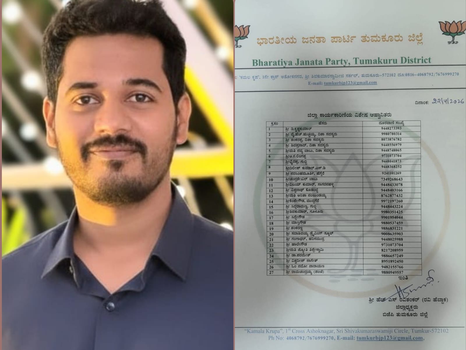 ತಿಪಟೂರು: ತುಮಕೂರು ಬಿಜೆಪಿ ಜಿಲ್ಲಾ ಕಾರ್ಯಕಾರಿಣಿಗೆ ವಿಶೇಷ ಆಹ್ವಾನಿತರಾಗಿ ಮಾಜಿ ಸಚಿವ ಬಿ.ಸಿ. ನಾಗೇಶ್ ಅವರ ಪುತ್ರ ವಿಶ್ವದೀಪ್ ಬಿ.ಸಿ. ನಾಗೇಶ್ ಅವರನ್ನು ನೇಮಕ ಮಾಡಲಾಗಿದೆ.ಇವರೊಂದಿಗೆ ಕುಣಿಗಲ್ ಬಿಜೆಪಿ ಮುಖಂಡ ಡಿ. ಕೃಷ್ಣಕುಮಾರ್, ಜಿಲ್ಲಾ ಪಂಚಾಯಿತಿ ಮಾಜಿ ಅಧ್ಯಕ್ಷ ಹಾಗೂ ದಿಶಾ ಸದಸ್ಯ ವೈ. ಹೆಚ್. ಹುಚ್ಚಯ್ಯ, ಆಯರಹಳ್ಳಿ ಶಂಕರಪ್ಪ, ಗುಬ್ಬಿ ಎಸ್.ಡಿ. ದಿಲೀಪ್ ಕುಮಾರ್ ಸೇರಿದಂತೆ ಒಟ್ಟು 27 ಜನರನ್ನು ವಿಶೇಷ ಆಹ್ವಾನಿತರಾಗಿ ಬಿಜೆಪಿ ಜಿಲ್ಲಾಧ್ಯಕ್ಷ ರವಿಶಂಕರ್ ಹೆಬ್ಬಾಕ ಅವರು ಆಯ್ಕೆ ಮಾಡಿದ್ದಾರೆ.